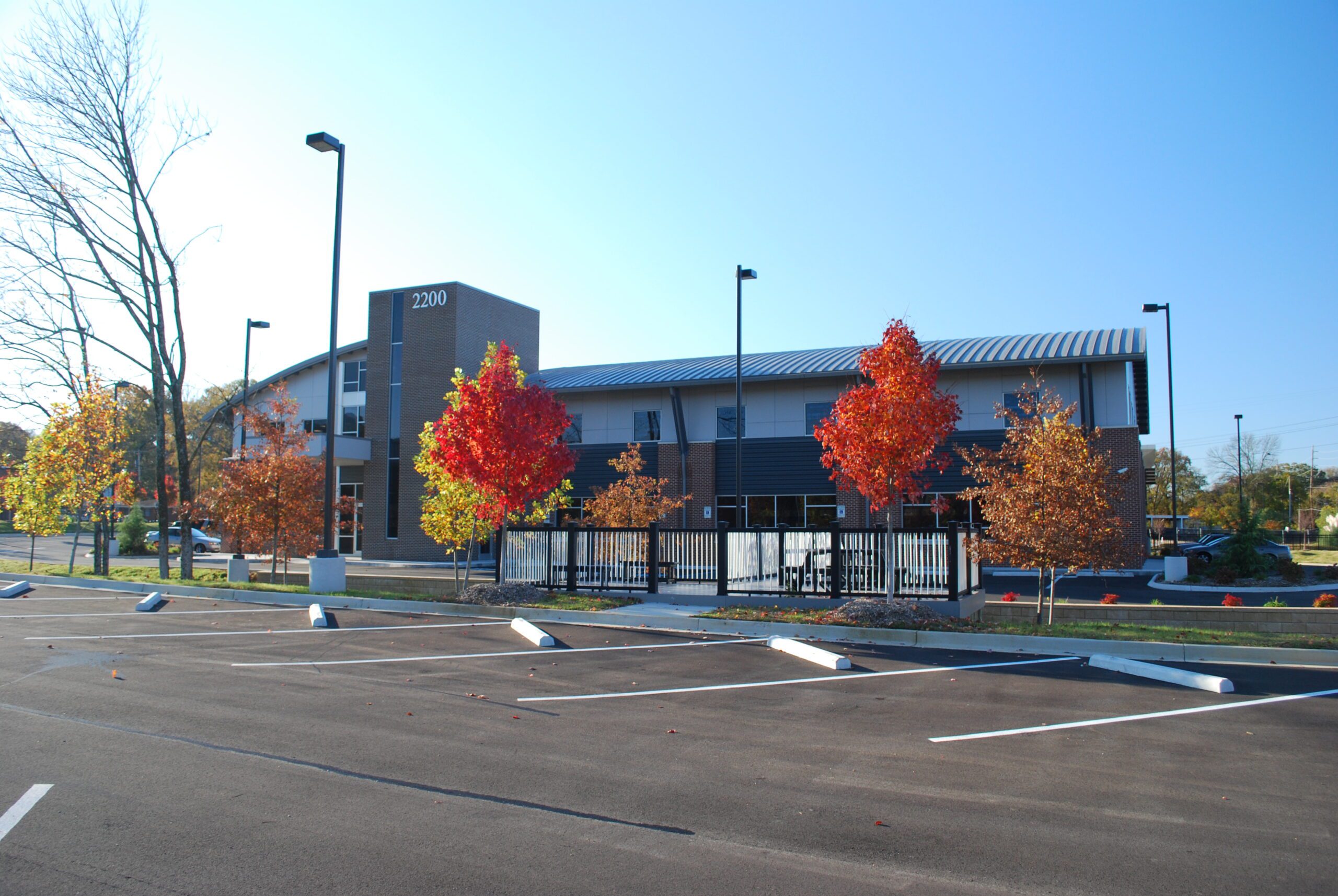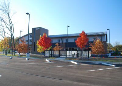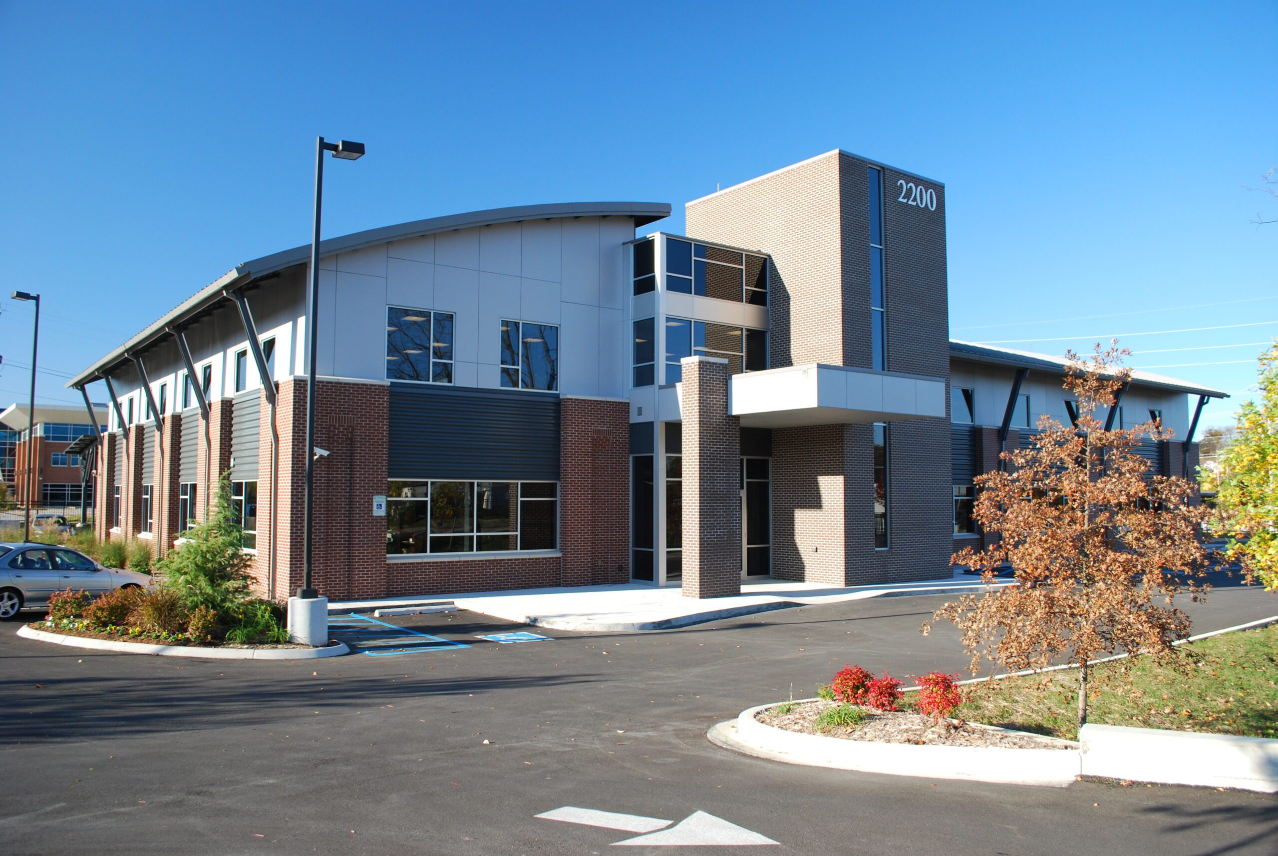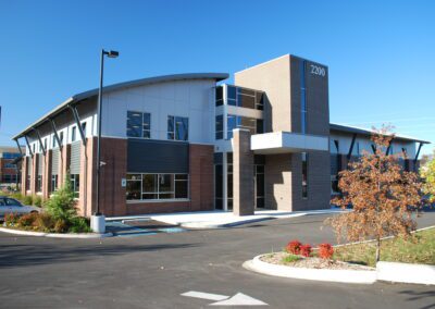 This project was developed as a speculative office for future medical practices. The two story design incorporates a barrel vaulted metal roof on steel trusses. The exterior second story facade is composed of a rain screen system which then rests on brick veneer construction to blend in with the surrounding community. The main entry is sheltered by a living roof covered with seedum planting. The stair and elevator shaft anchor the front of the building by expressing the vertical circulation between the two floors. In the back of the building a custom designed covered parking area was provided for doctors and staff.