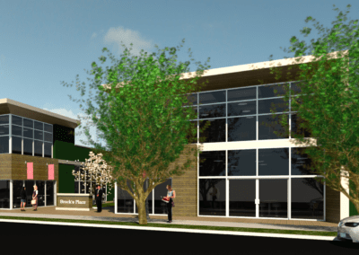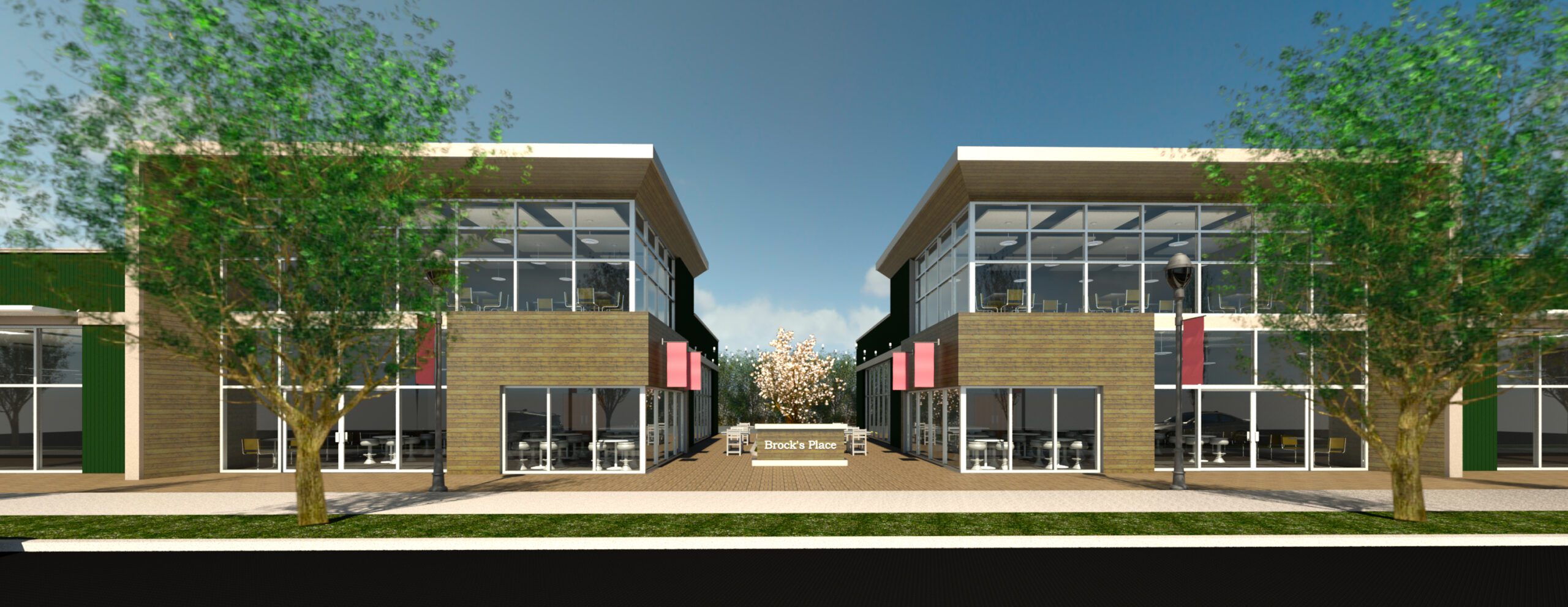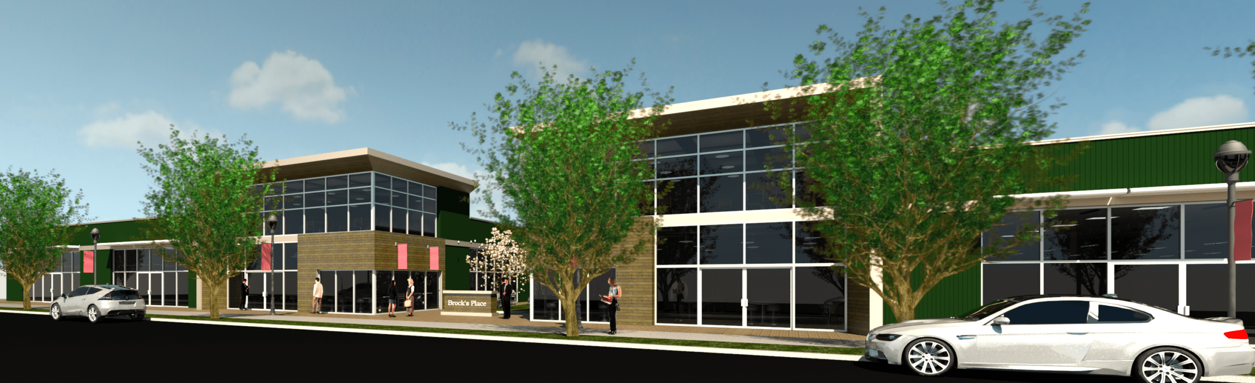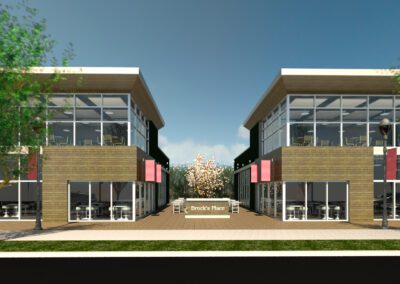 Speculative Commercial Retail comes in many different forms. From the high end glitzy to the eye catching cartoonish (think Pigeon Forge). The goal with this project was to create a visible identity that reflected the industrial nature of nearby developments while invoking a sense of place that serves as a destination. Vehicle parking occurs in the rear of the site as well as curb side on the street. An alley between the buildings allows access to the main anchor entrances. By adding landscaping and overhead light strings the space becomes more intimate for restaurant dining or as a common area for the public to gather.
